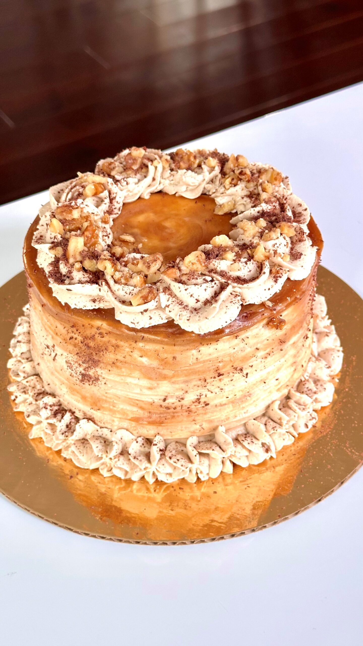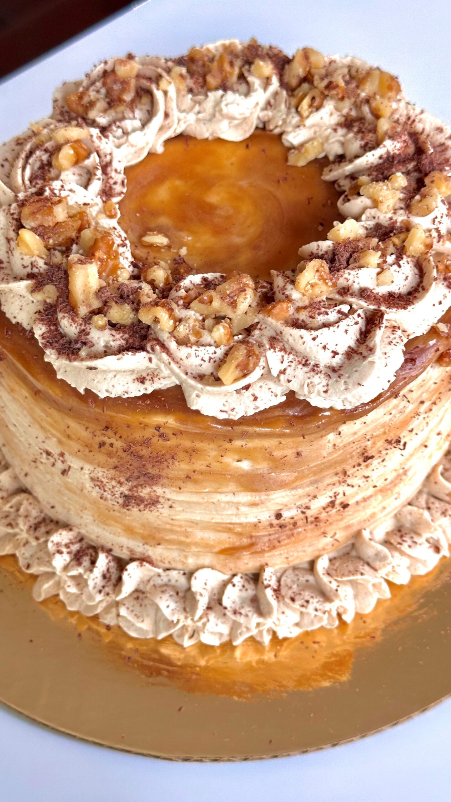 Experience the perfect balance of warm spices, rich caramel, and creamy coffee notes in our Dirty Chai Caramel Cake. This light and airy chiffon cake is made with real chai and bold spices, then lightly soaked in chai tres leches for extra moisture and flavor. Inside, you’ll find our house-made salted caramel paired with crunchy walnuts for the perfect texture and surprise element. Finished with a luscious coffee whipped cream frosting, every bite is harmonious, aromatic, and irresistibly indulgent.