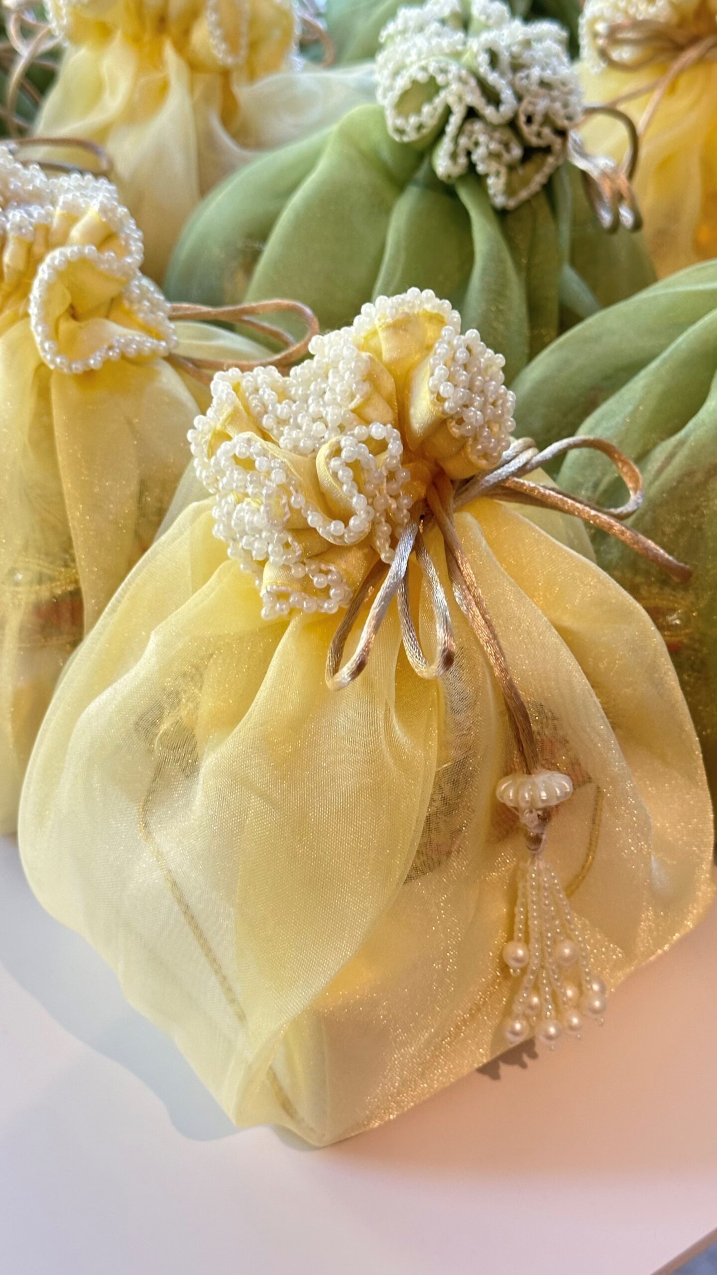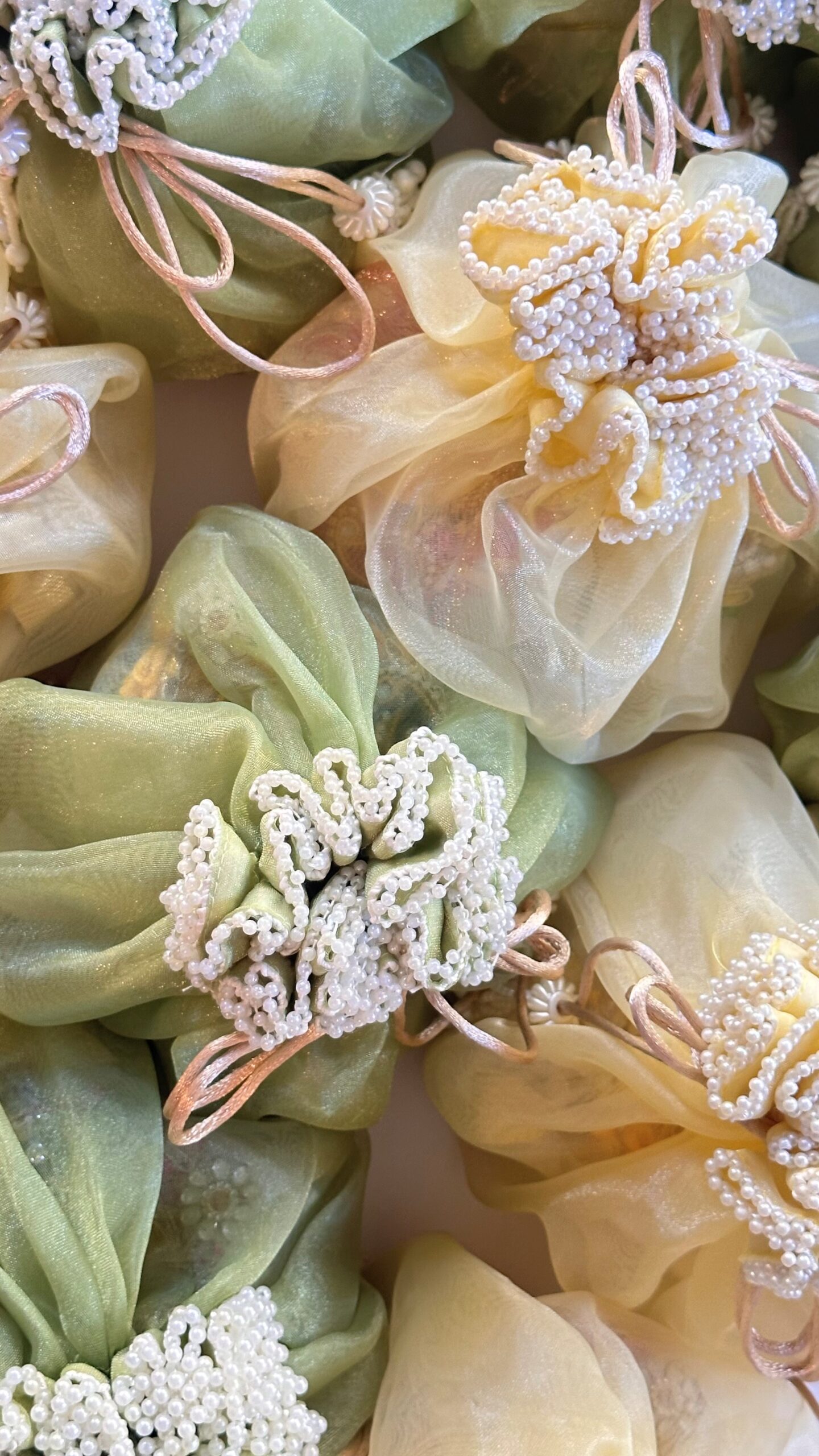Our Signature Pearl Potli is the finishing touch that transforms your dessert box into an elegant, ready-to-gift experience. Inspired by traditional South Asian potlis and reimagined with a modern luxury feel, this soft fabric pouch is delicately adorned with pearl detailing for a look that feels timeless, festive, and refined.